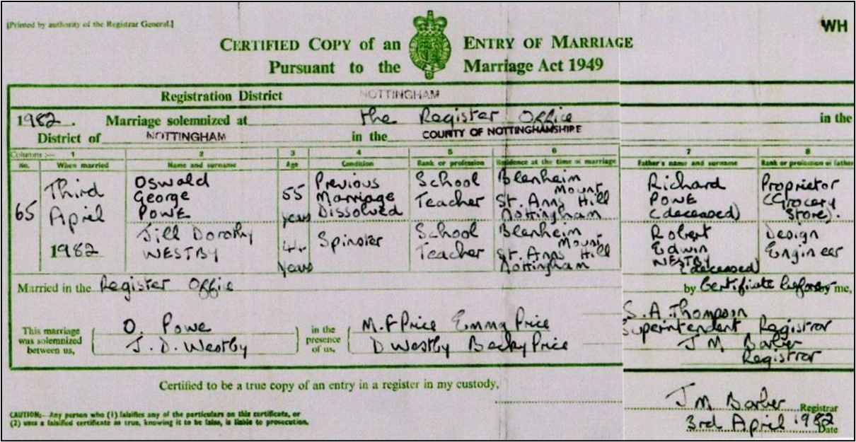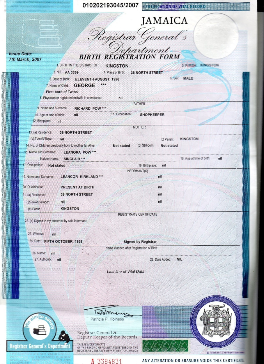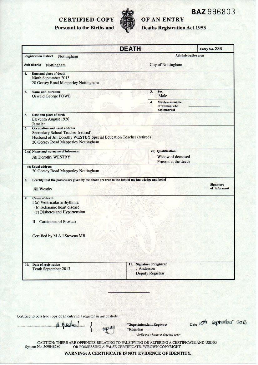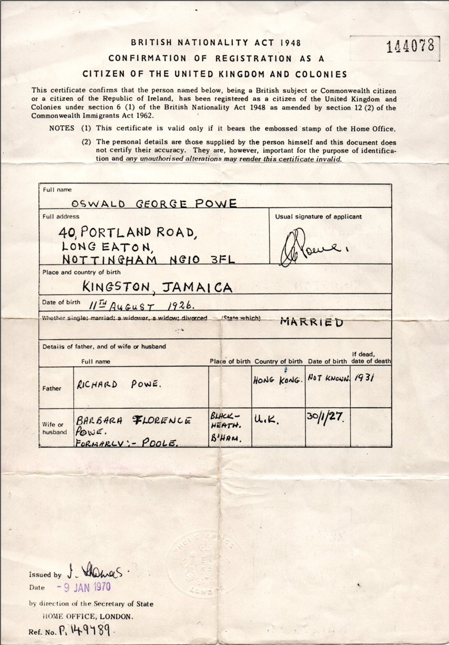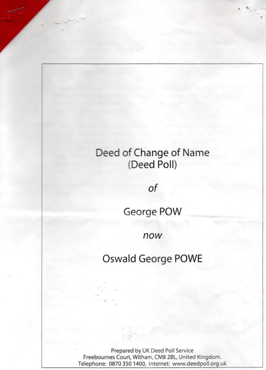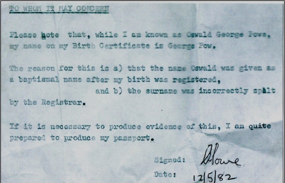 He signed the deed poll documentation for this on November 30, and the completed forms were lodged in the Record Office in Jamaica on March 4, 2008. This declaration, regularising his name as Oswald George Powe, clarified an eighty-two-year-old discrepancy.