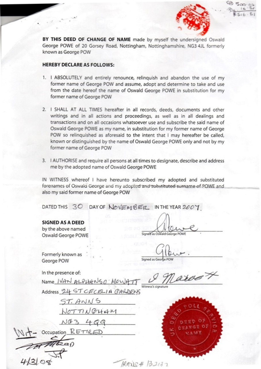 In 2007 he applied for a digitised copy of his birth certificate, presumably as supportive evidence for a change of name by Deed Poll.