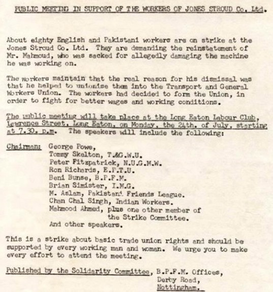 Such exploitation was not uncommon in the textile industry at that time. The last page of Brian Simister’s report includes a leaflet issued by the Black People’s Freedom Movement. It announced a public meeting to fight for better working conditions at Jones Stroud Company Limited, in Long Eaton, to be chaired by George.
