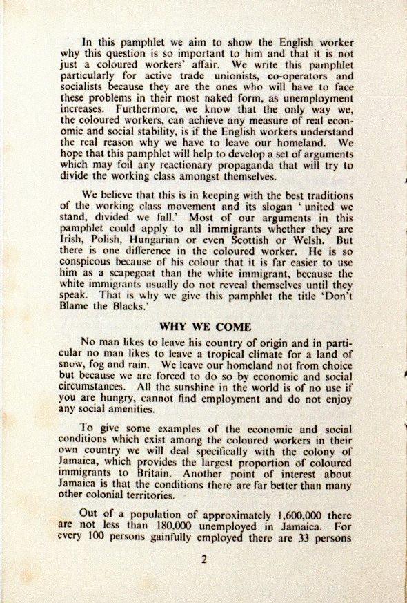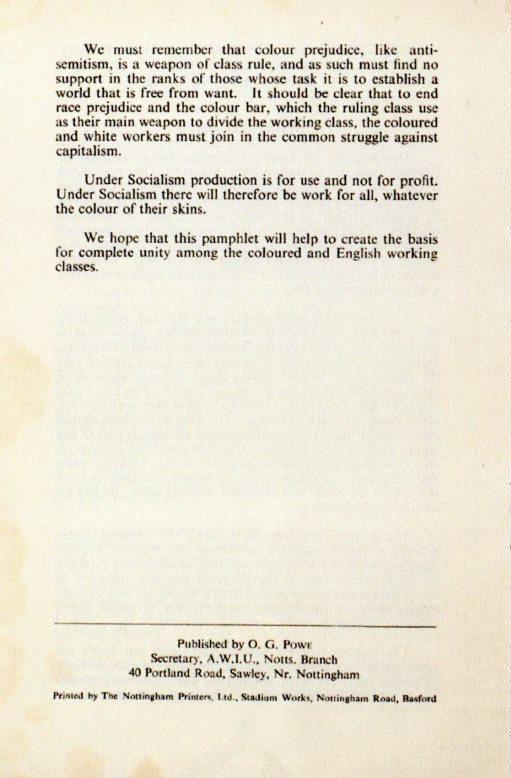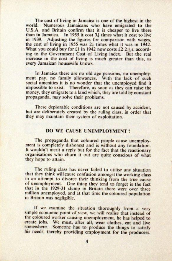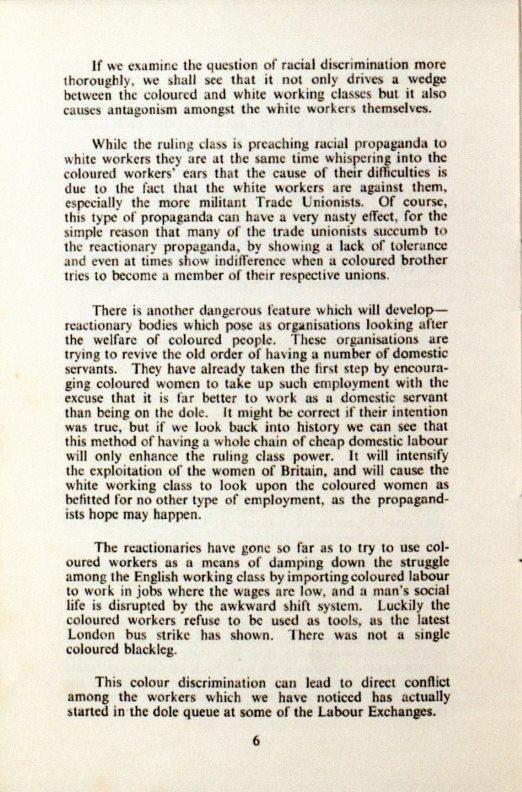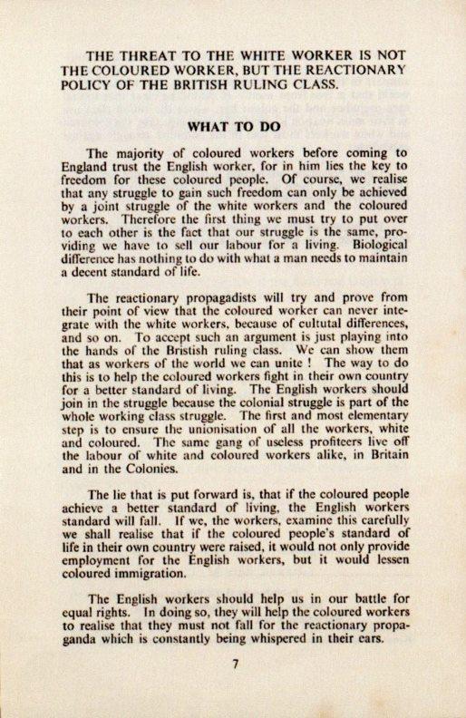 “Don’t Blame the Blacks” had argued: “The first and most elementary step is to ensure the unionisation of all the workers, white and coloured. The same gang of useless profiteers live off the labour of white and coloured workers alike, in Britain and in the Colonies.” It also stated; “We can show them that as workers of the world we can unite! The way to do this is to help the coloured workers fight in their own country for a better standard of living. The English workers should join in the struggle because the colonial struggle is part of the whole working-class struggle.”