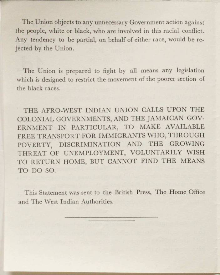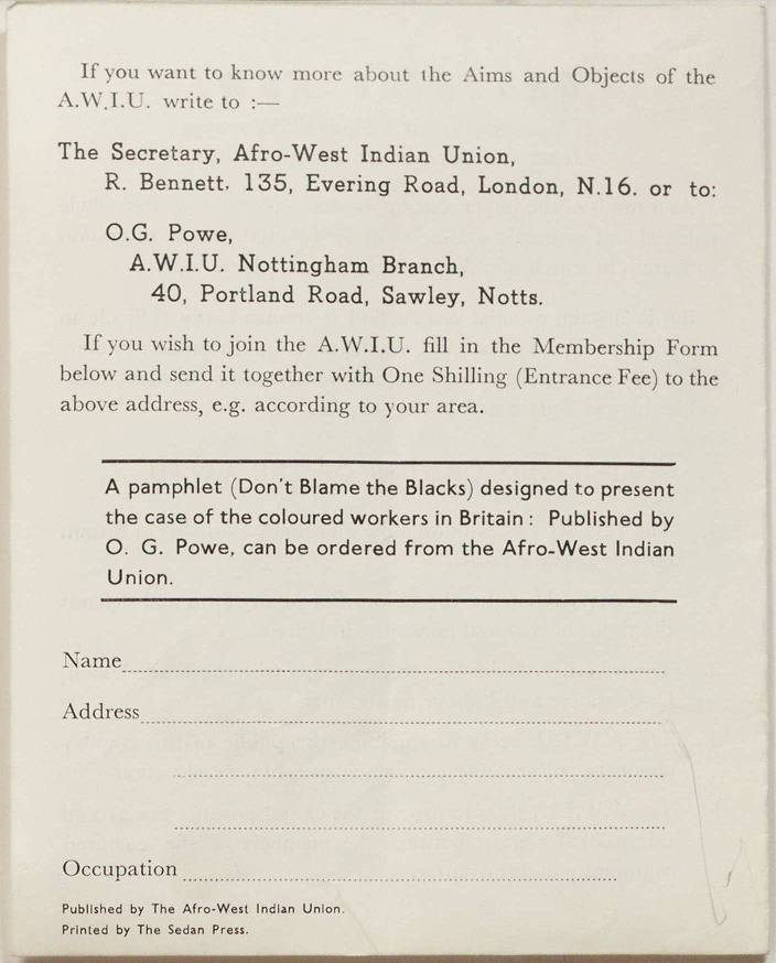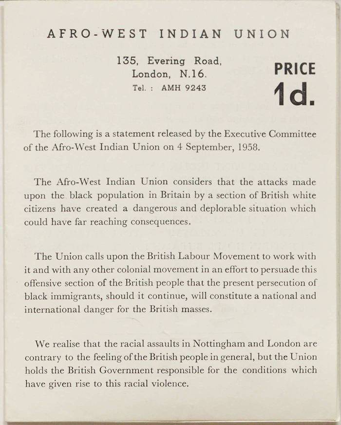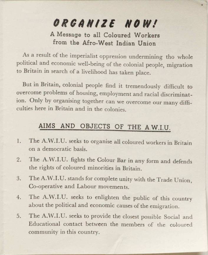 The Afro West Indian Union (AAWIU) was set up by George Powe and others in 1957 to represent ‘colonial workers’ to fight racial discrimination and to support anti-colonial struggles. AAWIU stood for ‘complete unity with the trade unions, co-operatives and labour movements’ and argued that ‘only by organising can we overcome the imperialist oppression in the colonies, and our own difficulties here in Britain’.