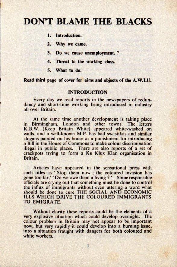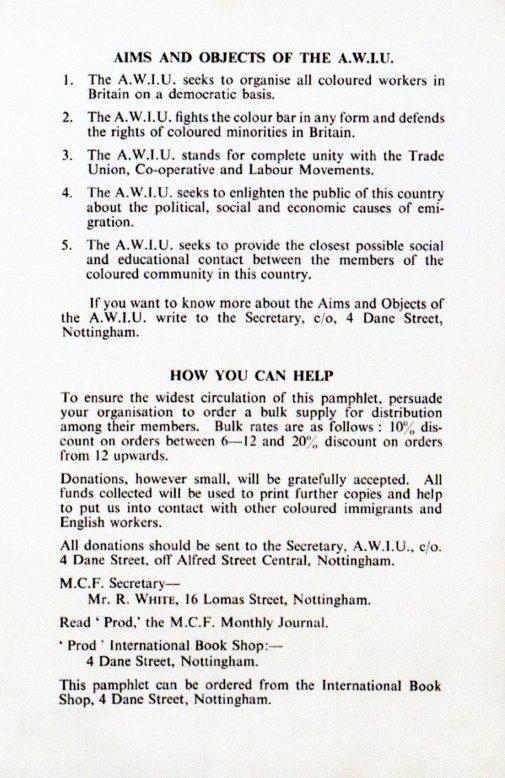 Shortly before the AWIU policy document was published, AAWIU (Nottingham), which had, interestingly, included “Asian” in its title, published a leaflet giving reasons for joining their campaign, alongside Don’t Blame the Blacks, a seminal pamphlet written and published by O.G.Powe.