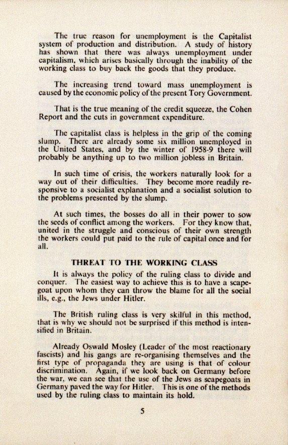 The threat to the white worker is not the coloured worker, but the reactionary policy of the British ruling class.